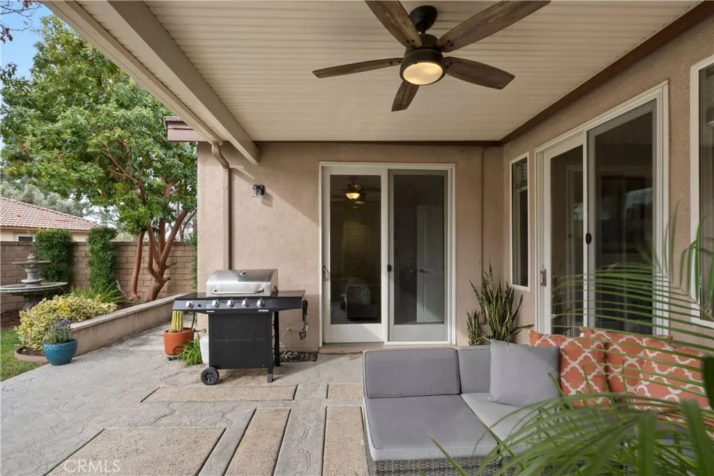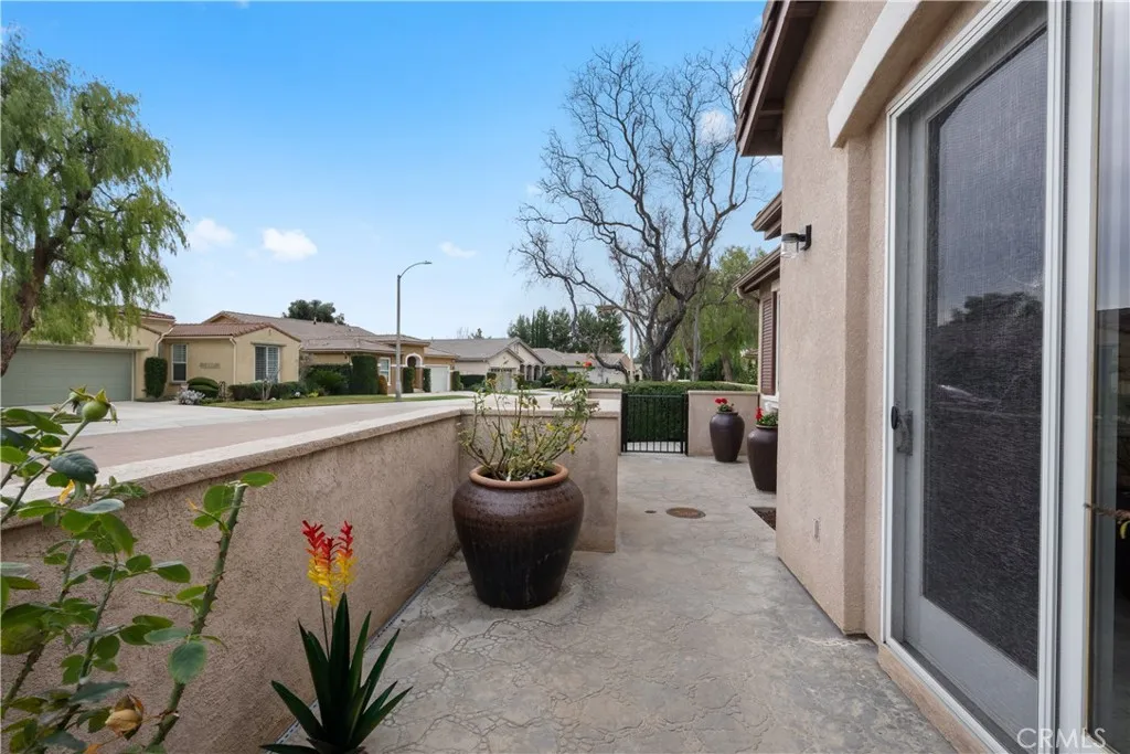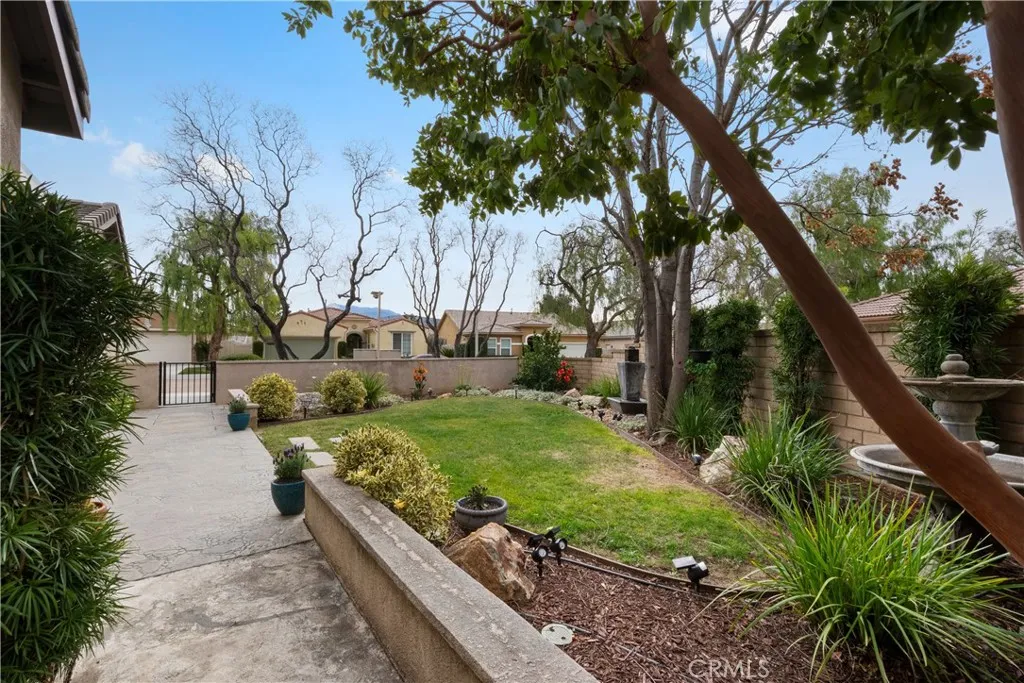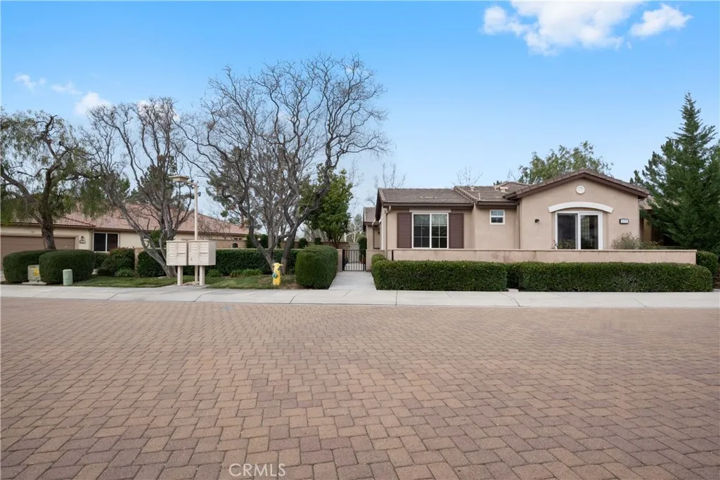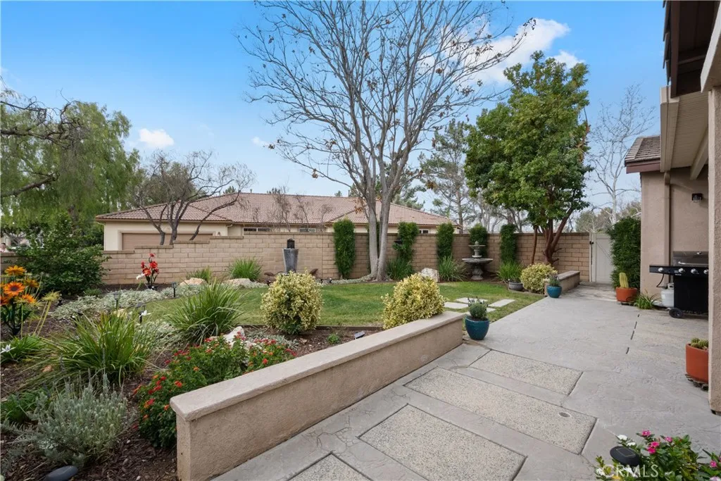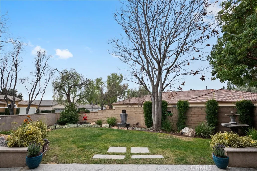 Welcome to this former model home, ideally located on a corner lot on the prettiest cobblestone street in Four Seasons at Beaumont, a premier 55+ resort-style community known for its vibrant lifestyle and exceptional amenities. Thoughtfully upgraded and meticulously maintained, this two-bedroom home offers the perfect blend of comfort, convenience, and low-maintenance living with one of the largest yards for this floorplan. Inside, you'll find 9' ceilings, 7 ' interior doors, and tile flooring throughout the entire home, including closets, creating a clean, cohesive look. The spacious great room flows seamlessly into the kitchen, which features under-cabinet lighting, a Kohler sink and faucet, and a Whirlpool counter-depth refrigerator that is included. The primary bedroom is a relaxing retreat with in-ceiling speakers and a ceiling fan with separate light and fan switches, while the second bedroom is generously sized - ideal for guests or a home office. In-ceiling speakers are also featured in the living room. Both bathrooms offer Corian countertops, with fiberglass showers for easy upkeep. Step outside through the impressive 8' Andersen sliding doors to a beautifully landscaped yard with a stamped concrete patio, aluminum patio cover with ceiling fan and light, gas BBQ stub, solar garden lighting, and a timed garden fountain. Additional highlights include holiday light outlets with interior switch, gutters with downspouts, and freshly painted eaves and shutters. The HOA maintains all landscaping outside the fence, while the yard is on automatic sprinklers with three timed stations. The garage includes overhead storage, plumbing for a utility sink, a golf cart outlet, and a smart garage door with keyless entry. A 2021 water heater, home alarm system, and Arlo video doorbell add modern convenience and peace of mind. Residents enjoy access to Four Seasons' resort-style amenities, including multiple clubhouses, grand ballroom, movie theater, library, bistro, craft and hobby rooms, billiards, and a computer center. Stay active with a fitness center, indoor lap pool, outdoor pool and spa, tennis and pickleball courts, bocce ball, basketball, shuffleboard, and over six miles of scenic walking and hiking trails, plus BBQ areas and a full calendar of clubs and activities. This home offers a rare combination of prime location, thoughtful upgrades, and access to one of Southern California's most sought-after active adult communities.