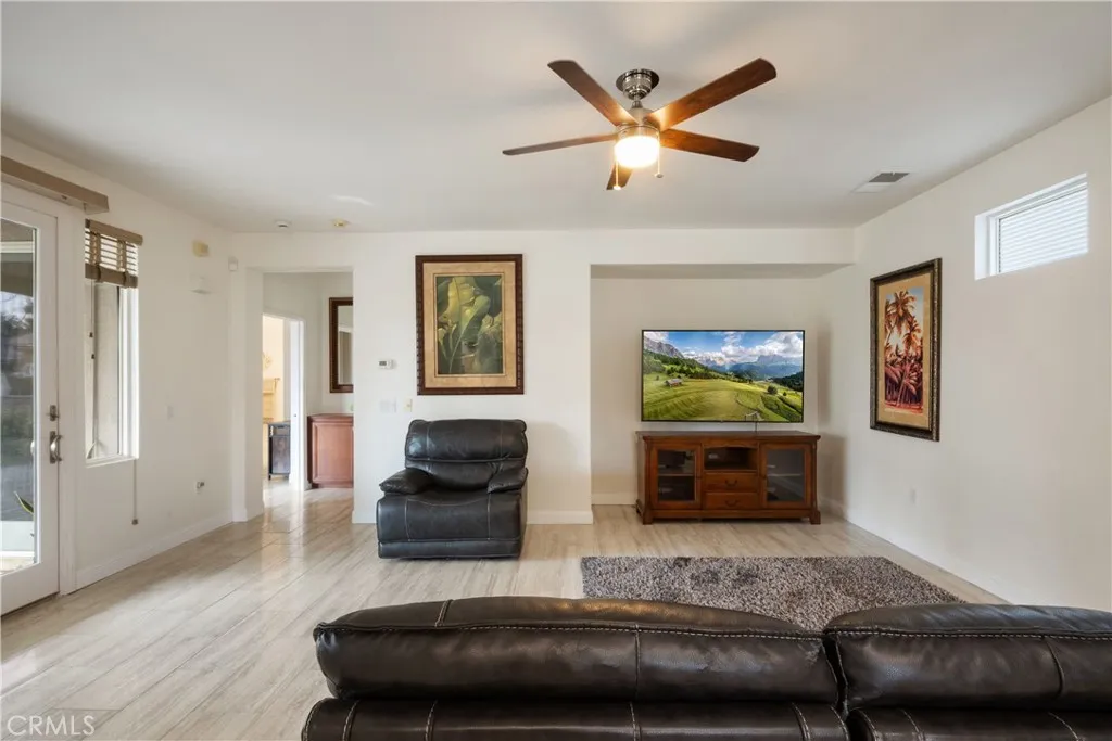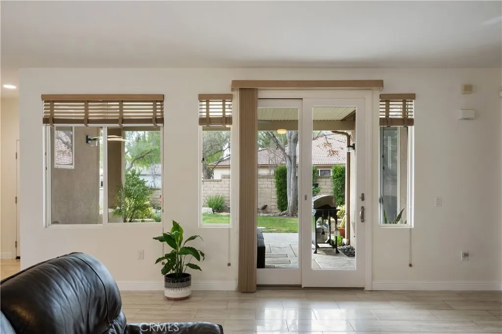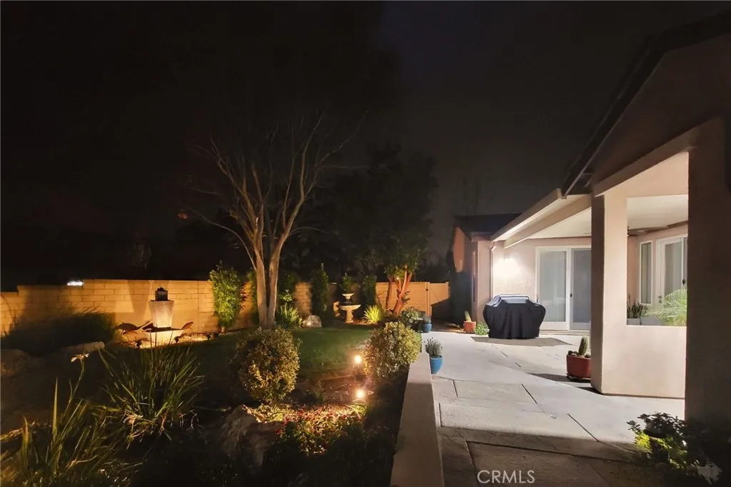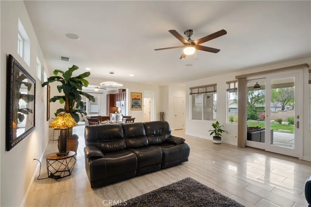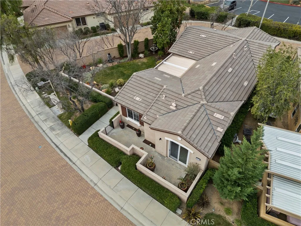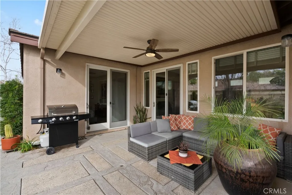 Welcome to this former model home, ideally located on a corner lot on the prettiest cobblestone street in Four Seasons at Beaumont, a premier 55+ resort-style community known for its vibrant lifestyle and exceptional amenities. Thoughtfully upgraded and meticulously maintained, this two-bedroom home offers the perfect blend of comfort, convenience, and low-maintenance living with one of the largest yards for this floorplan. Inside, you'll find 9' ceilings, 7 ' interior doors, and tile flooring throughout the entire home, including closets, creating a clean, cohesive look. The spacious great room flows seamlessly into the kitchen, which features under-cabinet lighting, a Kohler sink and faucet, and a Whirlpool counter-depth refrigerator that is included. The primary bedroom is a relaxing retreat with in-ceiling speakers and a ceiling fan with separate light and fan switches, while the second bedroom is generously sized - ideal for guests or a home office. In-ceiling speakers are also featured in the living room. Both bathrooms offer Corian countertops, with fiberglass showers for easy upkeep. Step outside through the impressive 8' Andersen sliding doors to a beautifully landscaped yard with a stamped concrete patio, aluminum patio cover with ceiling fan and light, gas BBQ stub, solar garden lighting, and a timed garden fountain. Additional highlights include holiday light outlets with interior switch, gutters with downspouts, and freshly painted eaves and shutters. The HOA maintains all landscaping outside the fence, while the yard is on automatic sprinklers with three timed stations. The garage includes overhead storage, plumbing for a utility sink, a golf cart outlet, and a smart garage door with keyless entry. A 2021 water heater, home alarm system, and Arlo video doorbell add modern convenience and peace of mind. Residents enjoy access to Four Seasons' resort-style amenities, including multiple clubhouses, grand ballroom, movie theater, library, bistro, craft and hobby rooms, billiards, and a computer center. Stay active with a fitness center, indoor lap pool, outdoor pool and spa, tennis and pickleball courts, bocce ball, basketball, shuffleboard, and over six miles of scenic walking and hiking trails, plus BBQ areas and a full calendar of clubs and activities. This home offers a rare combination of prime location, thoughtful upgrades, and access to one of Southern California's most sought-after active adult communities.
