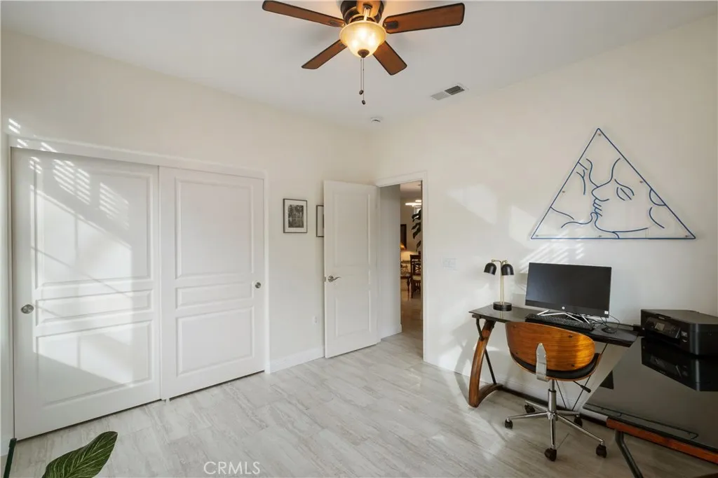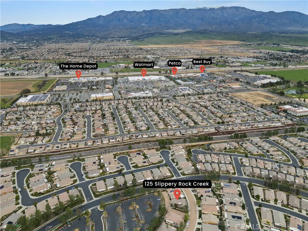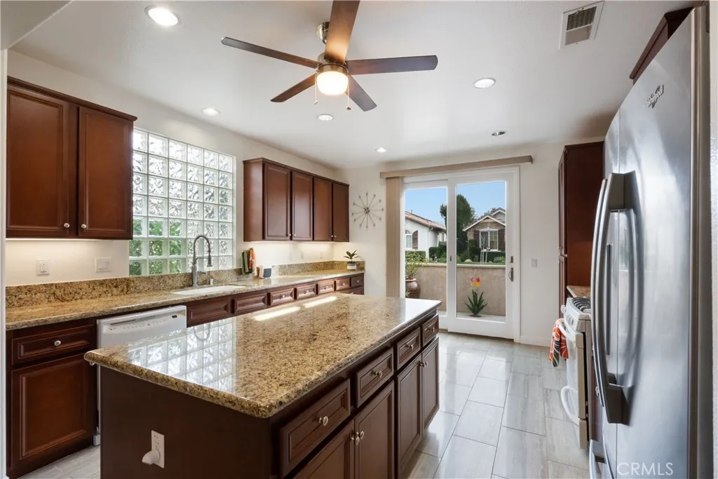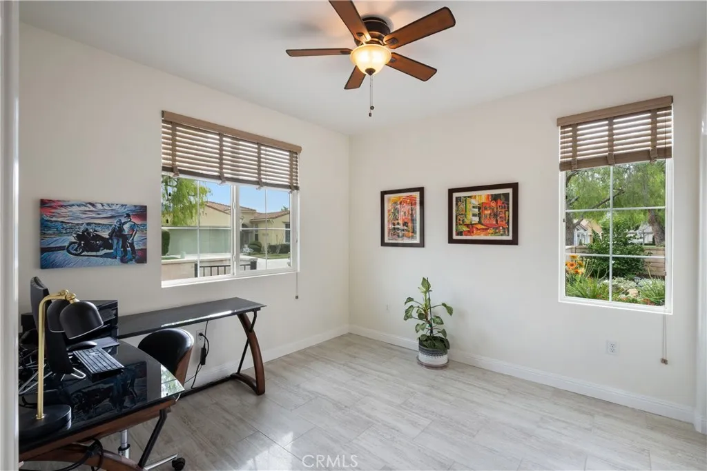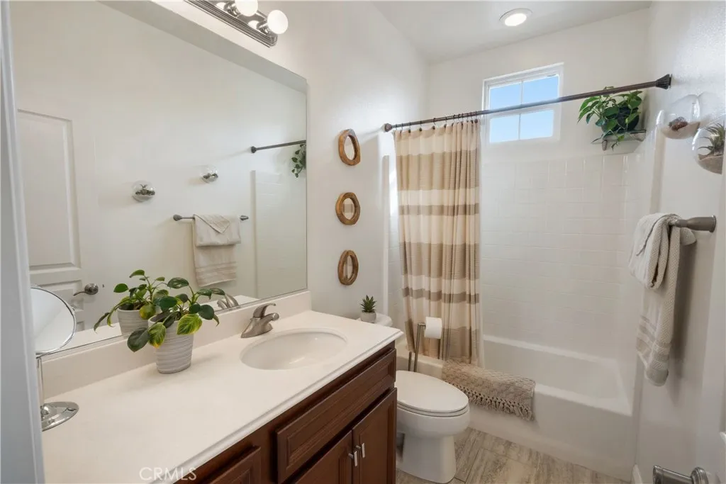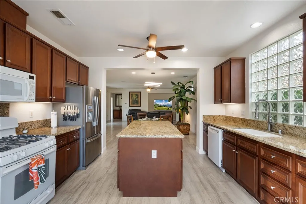 Welcome to this former model home, ideally located on a corner lot on the prettiest cobblestone street in Four Seasons at Beaumont, a premier 55+ resort-style community known for its vibrant lifestyle and exceptional amenities. Thoughtfully upgraded and meticulously maintained, this two-bedroom home offers the perfect blend of comfort, convenience, and low-maintenance living with one of the largest yards for this floorplan. Inside, you'll find 9' ceilings, 7 ' interior doors, and tile flooring throughout the entire home, including closets, creating a clean, cohesive look. The spacious great room flows seamlessly into the kitchen, which features under-cabinet lighting, a Kohler sink and faucet, and a Whirlpool counter-depth refrigerator that is included. The primary bedroom is a relaxing retreat with in-ceiling speakers and a ceiling fan with separate light and fan switches, while the second bedroom is generously sized - ideal for guests or a home office. In-ceiling speakers are also featured in the living room. Both bathrooms offer Corian countertops, with fiberglass showers for easy upkeep. Step outside through the impressive 8' Andersen sliding doors to a beautifully landscaped yard with a stamped concrete patio, aluminum patio cover with ceiling fan and light, gas BBQ stub, solar garden lighting, and a timed garden fountain. Additional highlights include holiday light outlets with interior switch, gutters with downspouts, and freshly painted eaves and shutters. The HOA maintains all landscaping outside the fence, while the yard is on automatic sprinklers with three timed stations. The garage includes overhead storage, plumbing for a utility sink, a golf cart outlet, and a smart garage door with keyless entry. A 2021 water heater, home alarm system, and Arlo video doorbell add modern convenience and peace of mind. Residents enjoy access to Four Seasons' resort-style amenities, including multiple clubhouses, grand ballroom, movie theater, library, bistro, craft and hobby rooms, billiards, and a computer center. Stay active with a fitness center, indoor lap pool, outdoor pool and spa, tennis and pickleball courts, bocce ball, basketball, shuffleboard, and over six miles of scenic walking and hiking trails, plus BBQ areas and a full calendar of clubs and activities. This home offers a rare combination of prime location, thoughtful upgrades, and access to one of Southern California's most sought-after active adult communities.
