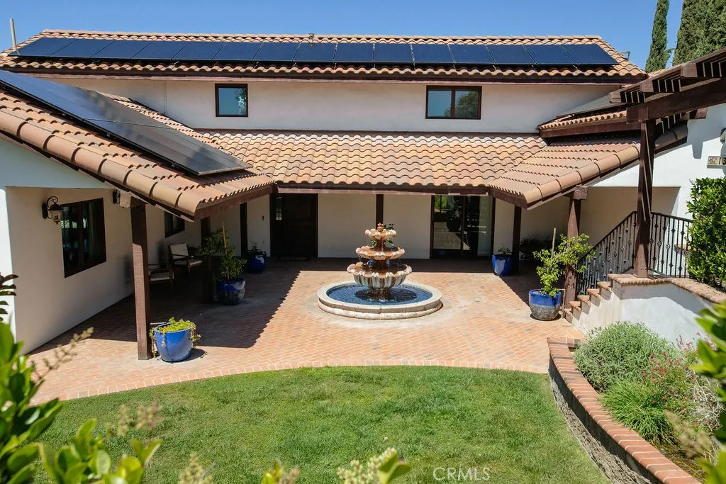 Stunning custom home with gorgeous VIEWS of Redlands! A private courtyard welcomes you in with a beautiful cascading fountain. Entry into the gorgeous hardwood floors. Large Chef's kitchen featuring beautiful Quartz countertops, wood cabinets, stainless steel appliances and Travertine floors. Dining area located off kitchen gazes over the sparkling pool; dine while enjoying the scenic VIEWS! Formal living room showcases a beautiful brick fireplace and beamed ceiling. Family room with sliding doors to backyard; perfect for entertaining. This home features not one but two primary suites. You decide if you prefer the primary suite that is located conveniently downstairs with double doors out to the pool/spa gazing into the beautiful VIEWS. This suite offers his and hers walk in closets, his and her sinks, walk in tile shower and fabulous copper tub. Or you may prefer the upstairs primary suite that includes a private balcony overlooking the VIEW of city lights. A 3rd additional bedroom with its own private bathroom and walk in closet also located upstairs. Head outside to this tranquil backyard and gaze into the cityscape and as you may suspect....scenic VIEWS. Enjoy the Sparkling pool and spa but head out a little past that and the possibilities are endless. Useable flat land is ready for your next project; whether it is an ADU, a large garage or perhaps a barn....this space is ready to be used! It is easily accessible from the side gate. Plenty of space here for RV parking, dune buggies, and other toys! 2 car attached garage, inside downstairs laundry room. Leased solar. This home is truly special and is in immaculate condition! Don't miss it! Welcome home!!!