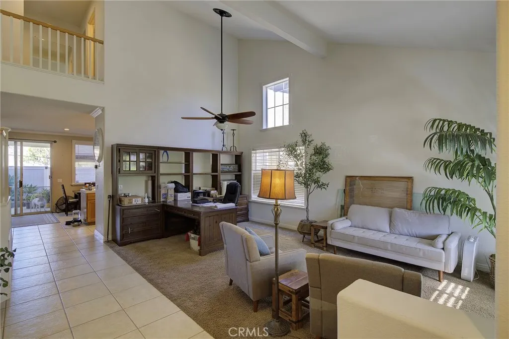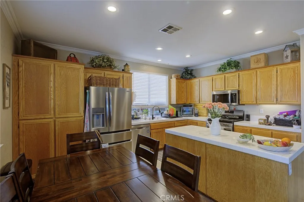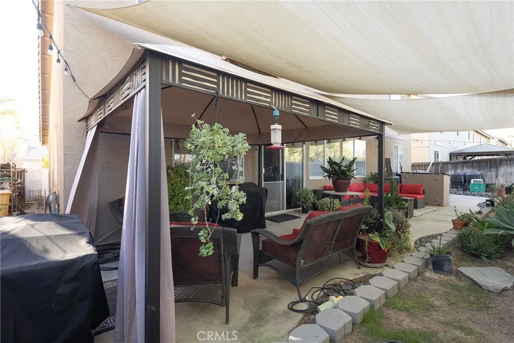 Spacious and desirable 4bd/2.75ba floorplan in the hillside community of Horsethief Canyon Ranch. Upon entering, you're greeted by a vaulted cathedral ceiling in the living room which leads to a formal dining room or additional social area. The kitchen is loaded with cabinet space and has a large island for food-prep. A new Frigidare Gallery stainless steel appliance suite is included for the buyer. A reverse osmosis system is under the sink. There is a breakfast nook for enjoying a quick meal or a snack. The family room has a cozy fireplace and built-in entertainment center. There is a good-sized bedroom with high ceiling and a bathroom with walk-in shower downstairs. Laundry room is also downstairs. Upstairs, there are two guest bedrooms, a full bathroom with dual-sink vanity. The master bedroom has a walk-in closet and large master bath with walk-in shower and soaker tub. All of the upstairs rooms have ceiling fans and there is a whole-house fan that helps keep things cool. In the 4-car garage, there is a tankless water heater, many added electrical outlets, a 220v receptacle for an air-compressor along with pneumatic hoses for your shop tools. Lots of built-in workbench space and shelving. There is a whole house water softener. Outside there is permanent holiday lighting and a hard-wired nine camera surveillance system. Low-maintenance backyard with an enclosed dog-run on the side. There is a robust solar system with battery backup that's on an excellent low-cost lease. Entire roof was replaced approximately 5 years ago. The community boasts tennis courts, club house, gym, (2) olympic-sized pools, and several parks. Horsethief Canyon Ranch is a great family community with a K-8 school, soccer, and baseball fields right in the community. Best of all, the community has NO MELLO ROOS, so taxes are low!