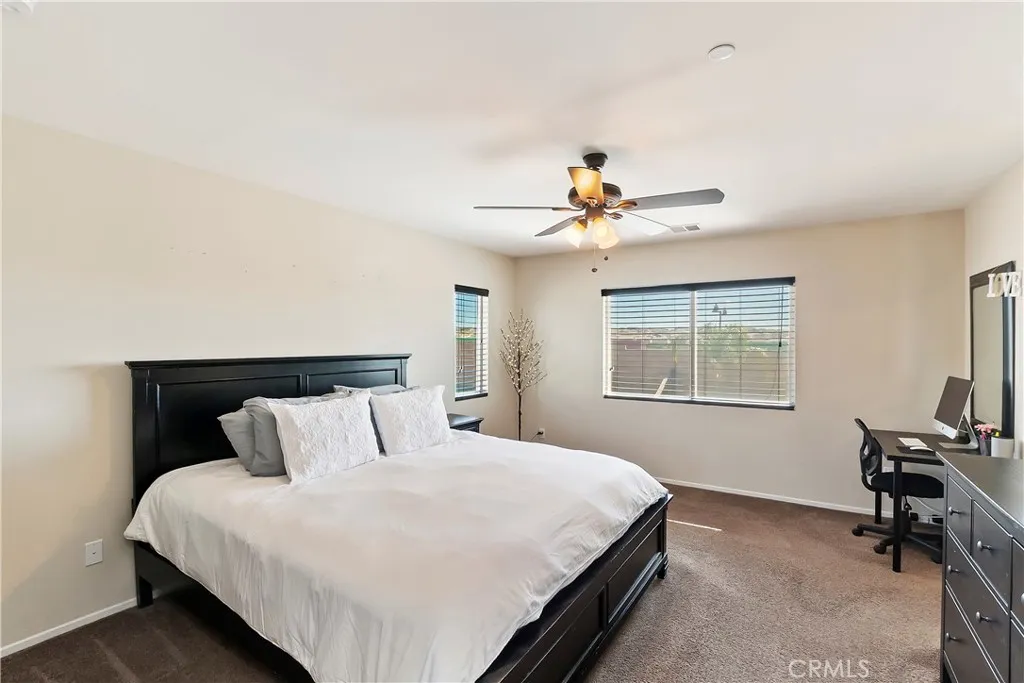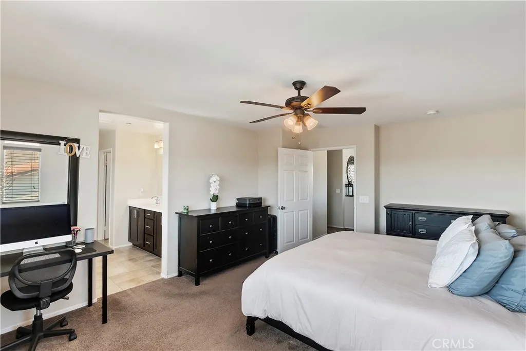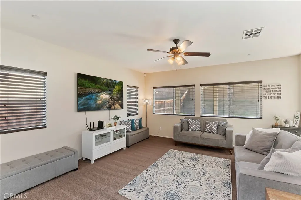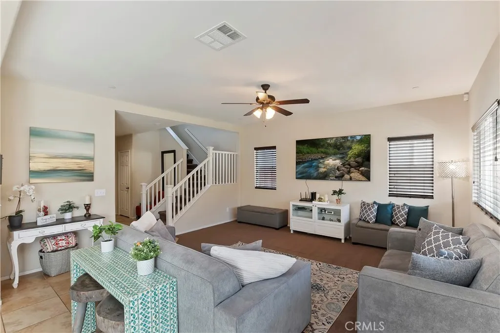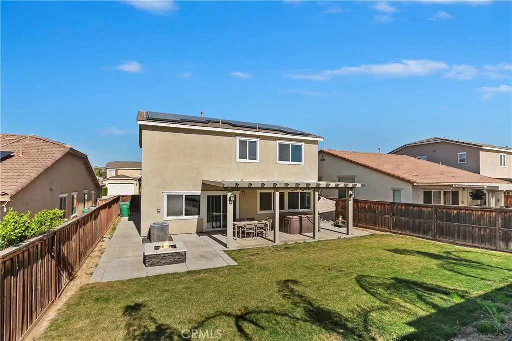 Welcome to this beautifully maintained 4-bedroom, 3-bath residence located on a quiet cul-de-sac in the highly sought-after Tournament Hills community. Built in 2014 and offering a FULLY PAID SOLAR SYSTEM - delivering immediate energy savings with no lease, no loan, and no added monthly payment - this 1,969 sq ft two-story home blends modern comfort with smart, cost-efficient living. Enjoy the advantage of significantly reduced utility bills and long-term protection against rising energy costs - a valuable upgrade that enhances both monthly affordability and future resale appeal. Inside, the open-concept layout is filled with natural light and ideal for everyday living and entertaining. The kitchen features granite countertops, rich dark cabinetry, stainless steel appliances, and generous prep space overlooking the main living area. Step outside to a private backyard retreat complete with a covered patio, built-in fire pit, manicured lawn, and scenic hillside backdrop - perfect for relaxing evenings or hosting gatherings. Additional highlights include an attached two-car garage and access to Tournament Hills' lake, parks, and walking trails. Conveniently located near golf courses, shopping, dining, and easy access to the 10 and 60 freeways.